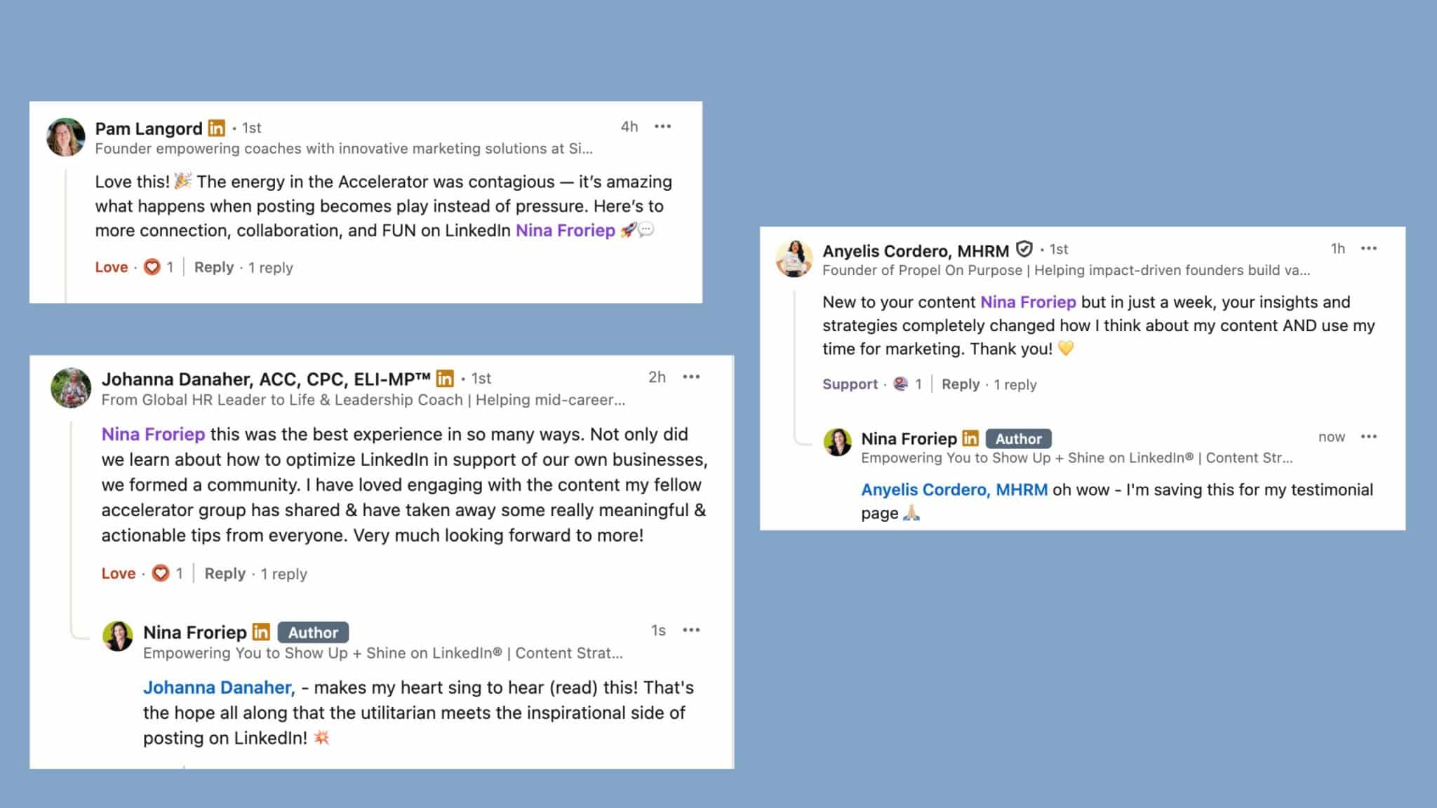 The LinkedIn Accelerator is a crash course in LinkedIn creation and posting best practices wrapped in an engagement group* format. Over the course of three weeks (and four calls) you'll get to experience for yourself what being a top-performer on LinkedIn feels like. Spoilers, it's great!